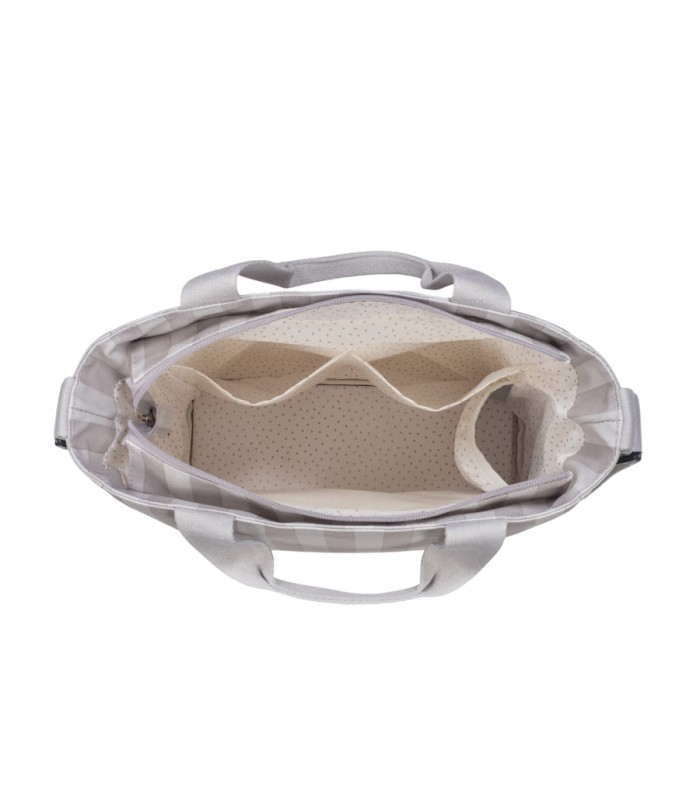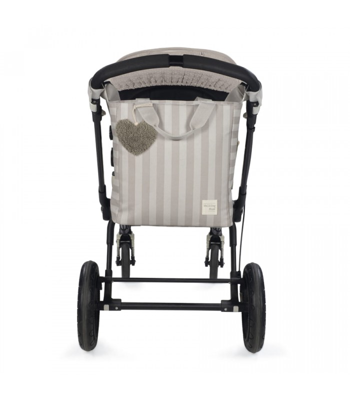 Bolso cambiador Sintra de raya beige para silla de paseo que incluye cambiador para bebe. Bolsa canastilla muy ligera, resistente y de gran capacidad para llevar todo lo necesario para el paseo del bebe.