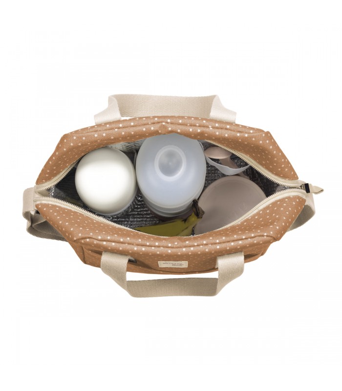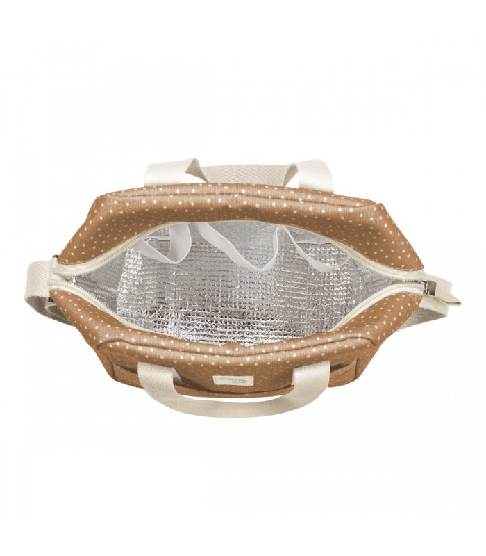 Bolsa térmica para biberones Poppy Canela de topitos. Mantiene la temperatura durante 4 horas.